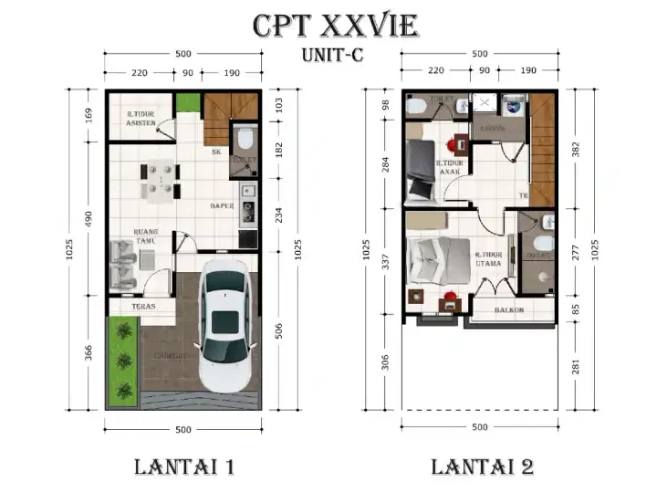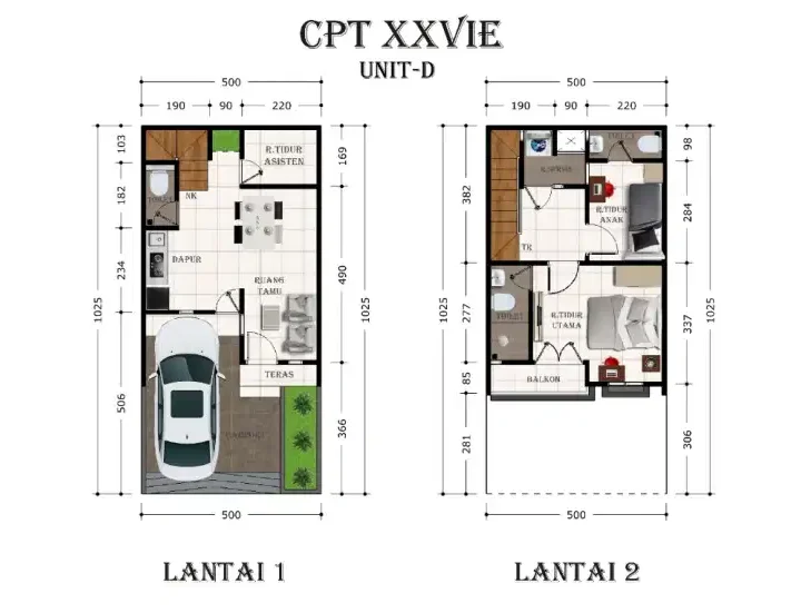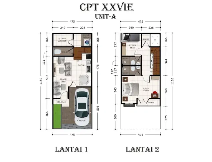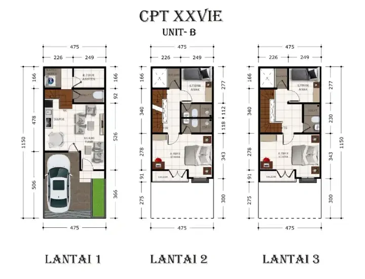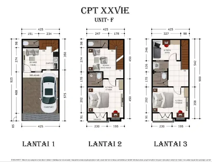 – Bangunan 3 lantai untuk yang membutuhkan ruang lebih, dengan luas tanah 39 m2 (4.25 x 9.25) dan luas bangunan 77 m2. Terdiri dari 3 kamar tidur, carport, ruang tamu, dapur, dan 3 kamar mandi.