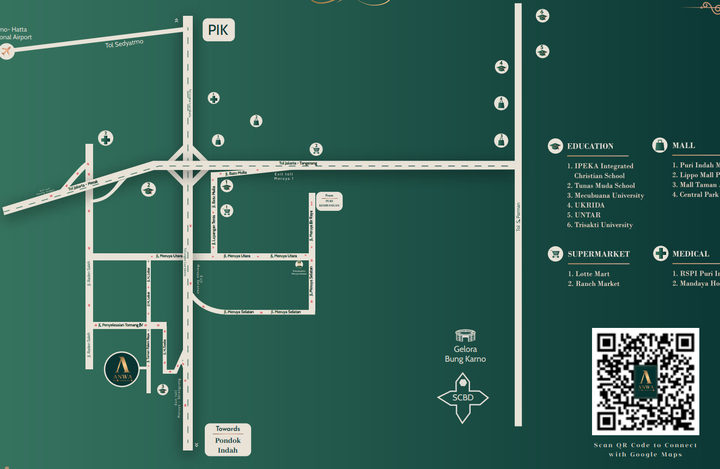 • 10 menit ke Lotte Mart Meruya • 10 menit ke Pintu Tol Meruya Selatan • 10 menit ke Sekolah IPEKA • 10 menit ke Universitas Mercu Buana • 10 menit ke RSUD Kembangan • 15 menit ke Tol Puri • 15 menit ke RS Pondok Indah Puri Indah • 15 menit ke Mall Puri Indah • 15 menit ke Lippo Mall Puri • 20 menit ke Central Park Mall • 20 menit ke Mall Taman Anggrek • 30 menit ke kawasan SCBD • 40 menit ke Bandara Soekarno-Hatta